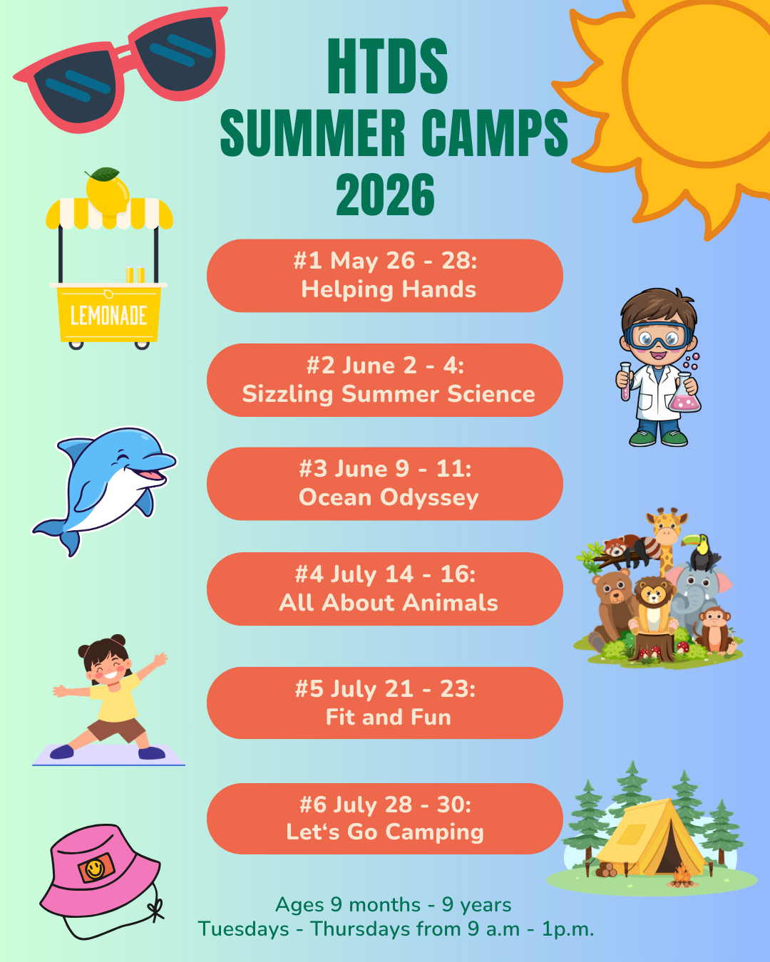 Camps serve children 9 months to 9 years. Recent graduates and older siblings are welcome.
